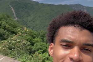 聊啥呢?杨瀚森场边和阿夫迪亚有说有笑 还靠了下对方的肩膀